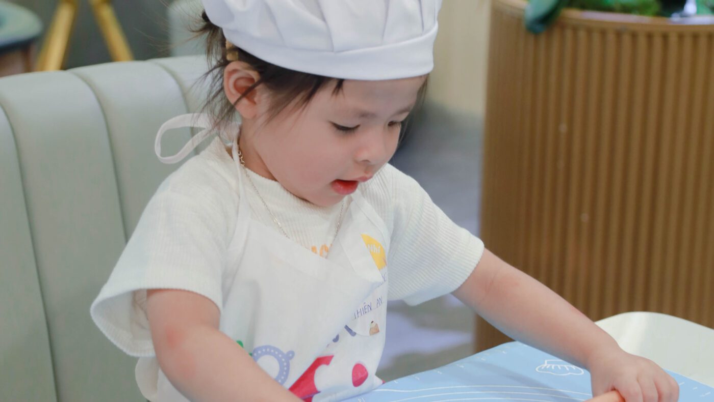 Với chiếc tạp dề nhỏ gọn, mũ đầu bếp xinh xắn, các “thợ làm bánh nhí” được chú đầu bếp hướng dẫn từng bước để làm ra những chiếc bánh donuts tròn xoe, mềm xốp. Từ khâu trộn bột, nặn bánh, đến lúc bánh được đưa vào lò chiên vàng ruộm, bé nào cũng chăm chú và háo hức. Có bạn còn cẩn thận đếm từng chiếc bánh “mình làm được mấy cái rồi cô ơi!”